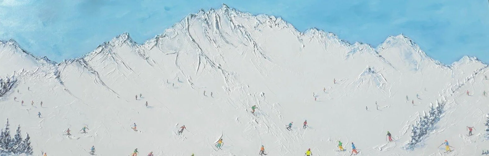 Leanora’s work captures the shifting light on snow, the depth of alpine forests and the textures of the mountain landscape. Playful skiers often appear within the scenes, bringing movement and energy to the compositions.